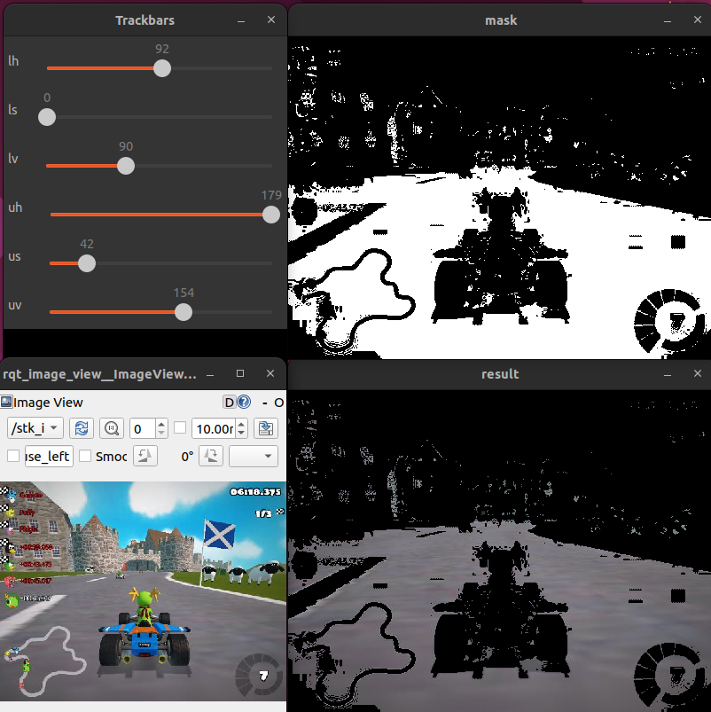 hsv_calc, handles the image processing and slider setup:def hsv_calc(self, msg): if self.initial_flag: self.initial_flag = False cv2.namedWindow("Trackbars") cv2.createTrackbar("lh", "Trackbars", 0, 179, self.nothing) cv2.createTrackbar("ls", "Trackbars", 0, 255, self.nothing) cv2.createTrackbar("lv", "Trackbars", 0, 255, self.nothing) cv2.createTrackbar("uh", "Trackbars", 179, 179, self.nothing) cv2.createTrackbar("us", "Trackbars", 255, 255, self.nothing) cv2.createTrackbar("uv", "Trackbars", 255, 255, self.nothing) frame = self.bridge.imgmsg_to_cv2(msg, "bgr8") hsv = cv2.cvtColor(frame, cv2.COLOR_BGR2HSV)